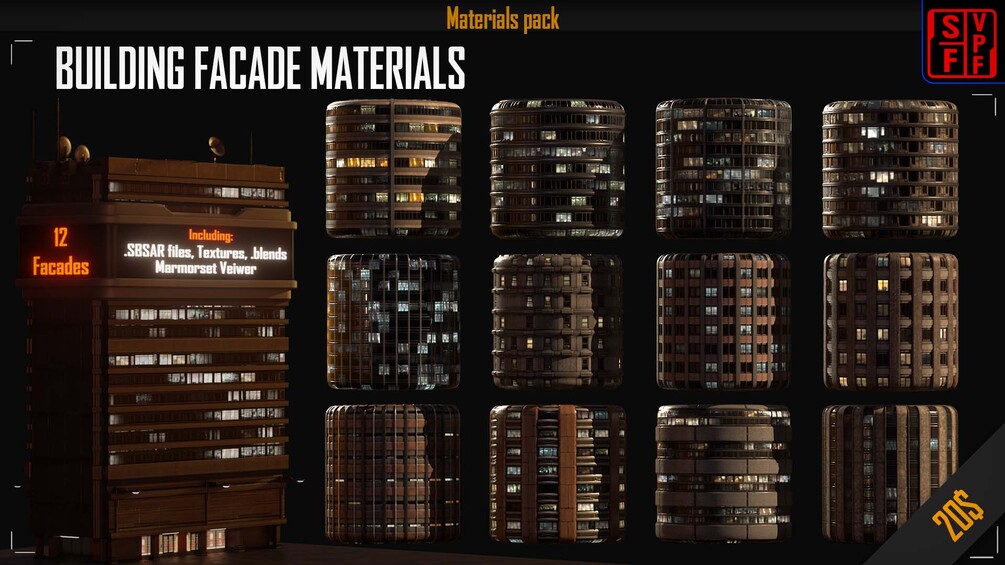 A pack of Building facade materials I've been working on for a personal project, went ahead and cleaned up the files & make it available to purchase, these materials include SBSAR files with controllable parameters that vary from emission intensity, masking random window lights, .blend files, etc. My plan with this project is to update it down the line with some new parameters and other features.